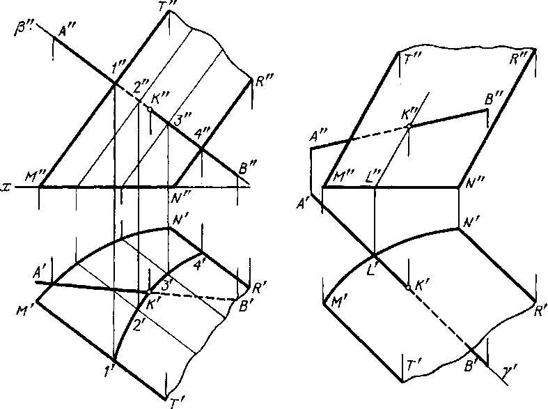 кривой MN и направлением образующей прямой МТ. Через прямую АВ